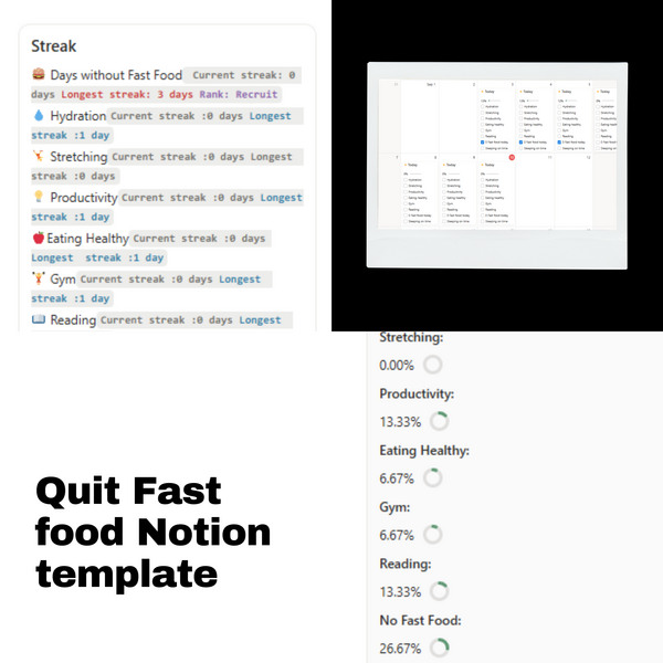 Notion template to quit fast food: Streak tracker + money saved + monthly habit tracker ......